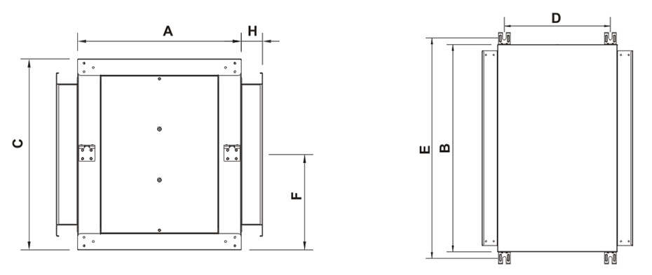 型号 | 产品尺寸(mm) | 出风口内尺寸 | 进风口内尺寸 | 适用风量 | ||||||||